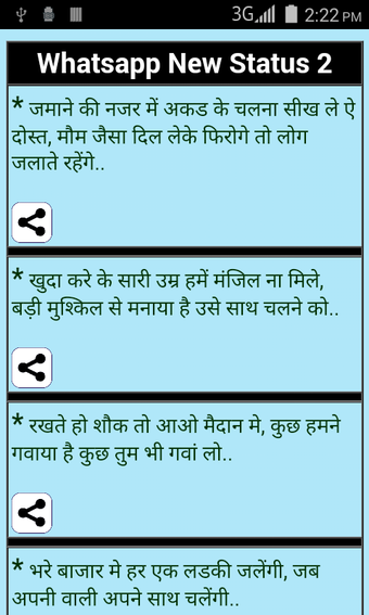 status jo sabko hila de - تطبيق حيث يمكنك مشاركة مشاعرك في شكل الحالة والاقتباسات. الغرض من التطبيق هو السماح لك بالتعبير عن مشاعرك بأفضل طريقة ممكنة. لذلك ، لدينا مجموعة خاصة من أنواع مختلفة من الحالات والاقتباسات. يمكنك مشاركتها على حسابات وسائل التواصل الاجتماعي الخاصة بك ، أو حتى إرسالها مباشرة إلى أصدقائك وعائلتك.